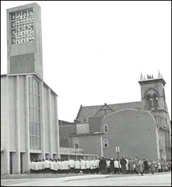 A procession of the congregation from its former nave (in use since 1896) to the current building took place on Sunday, February 28, 1960. Members were led by the Rev. Frederick G. Hasskarl, Senior Pastor; the Rev. Paul F. Bosch, Assistant Pastor; and the Rev. Dr. J. Ray Houser, President of Waterloo Seminary and former pastor.